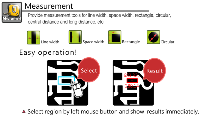 Provide measurement tools for circular, line width, space width, rectangle, central distance and long distance.