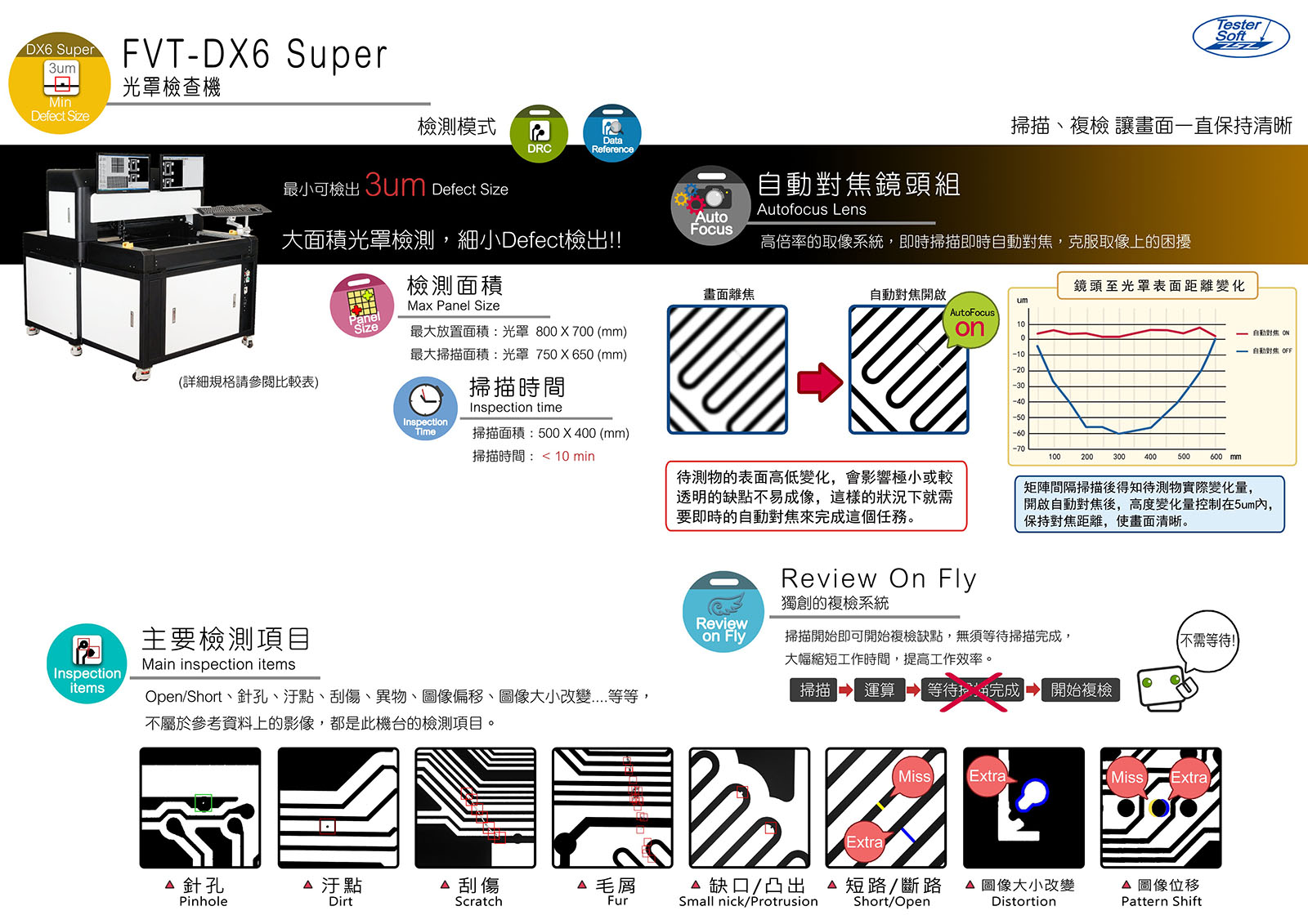 大面積光罩檢測,最細小缺陷檢出;自動對焦系統,解決離焦困擾。最小可檢3um缺點。